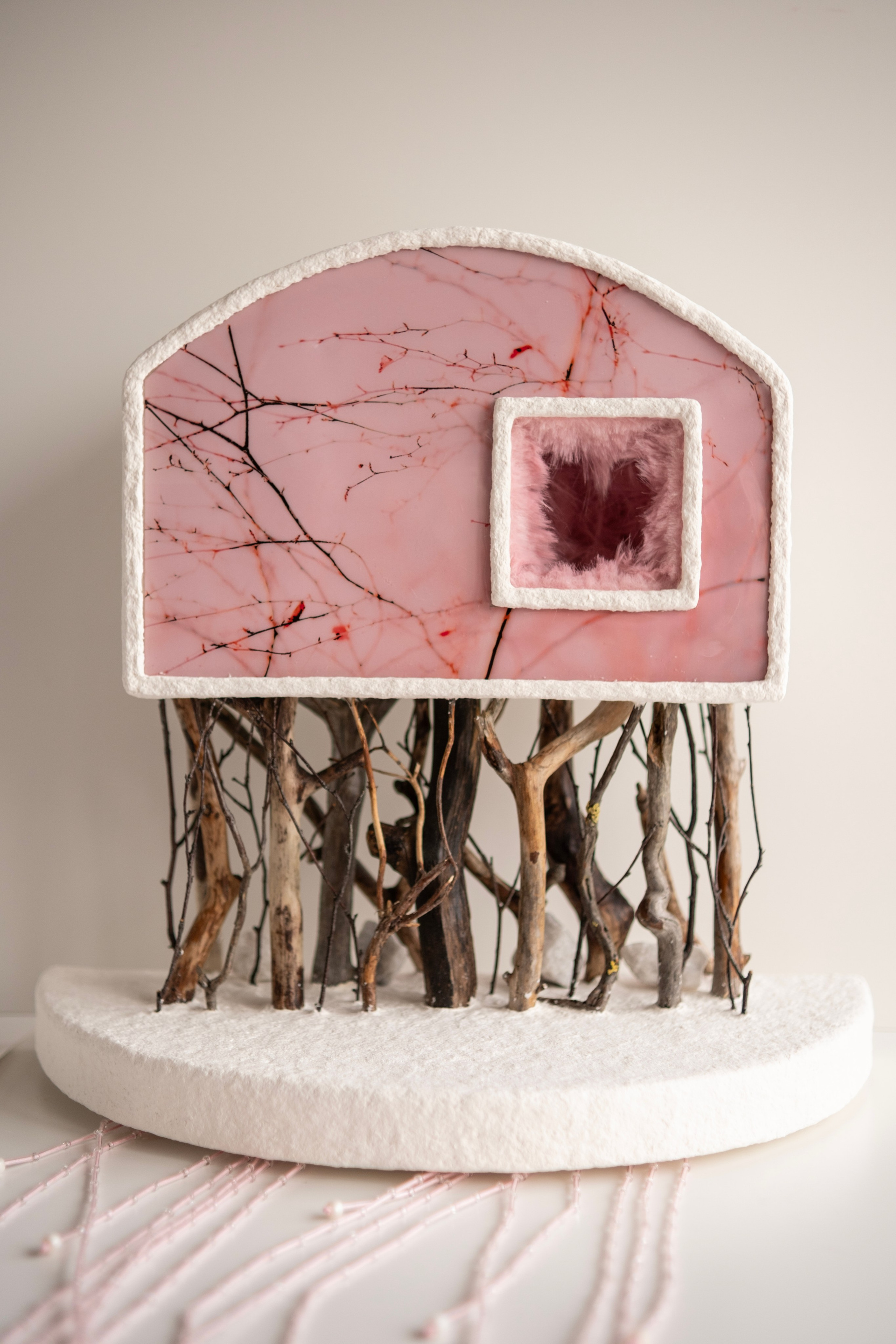 «Сердце дома» — камерная инсталляция, пространство заботы в форме небольшого дома, встроенного в плотную ветвистую структуру, напоминающую лес. Здесь лес — не образ природы, а среда внутренних состояний. Свисающие нити бисера мягко фиксируют эмоциональные следы, укореняя их в материале.